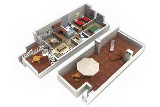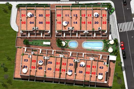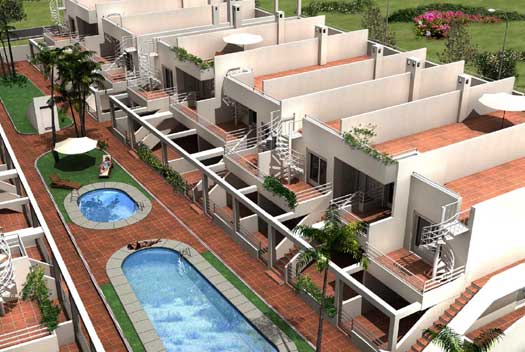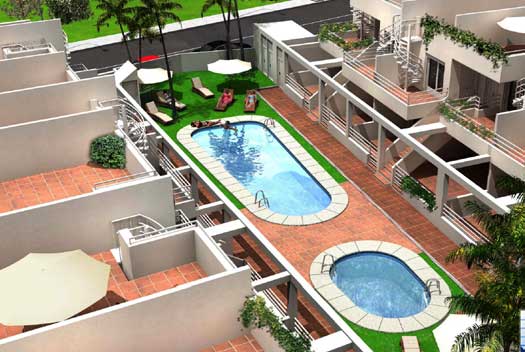 dúplex de 1 ó 2 dormitorios con amplios jardines, terrazas y solariums privados.